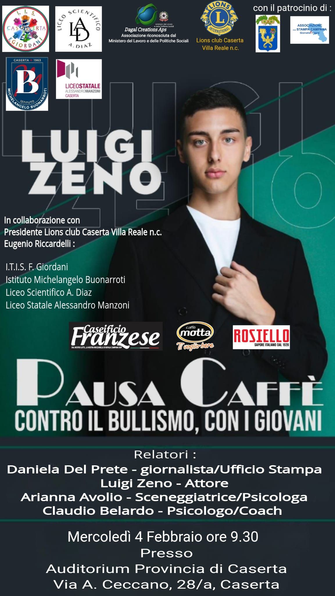 L’evento si terrà mercoledì 4 febbraio alle ore 9:30 presso l’Auditorium della Provincia di Caserta con il patrocinio dell' Associazione Stampa Campana- Giornalisti Flegrei e della Provincia di Caserta . Protagonista dell’incontro sarà il giovane attore e testimone sociale Luigi Zeno, volto emergente del cinema italiano, protagonista della serie Minerva - La Scuola di Netflix, premiato per il suo impegno sociale e per la sua interpretazione nel cortometraggio La Linea Sottile, che affronta con intensità il tema del bullismo giovanile.